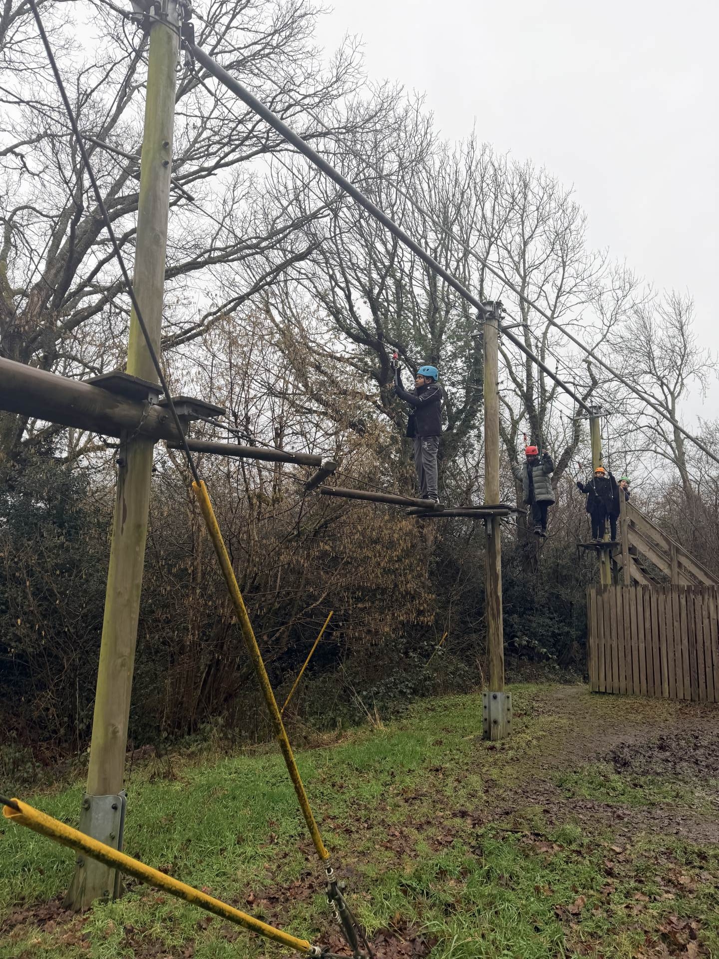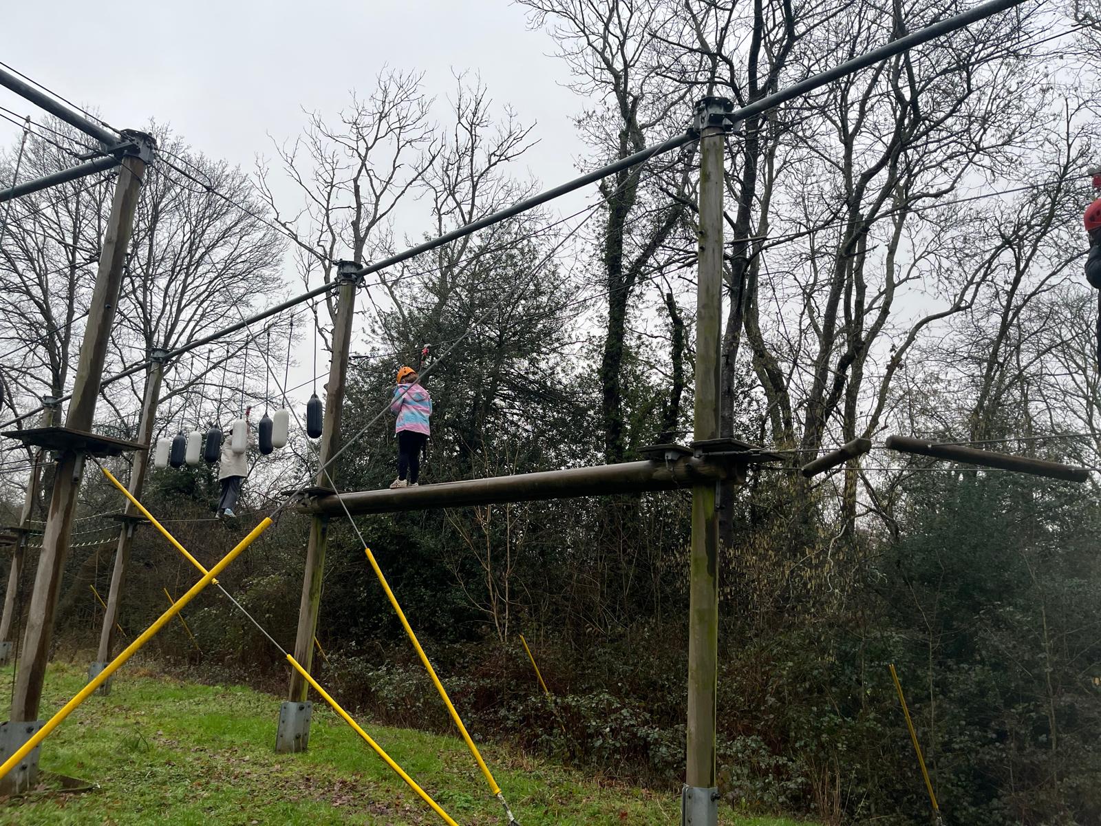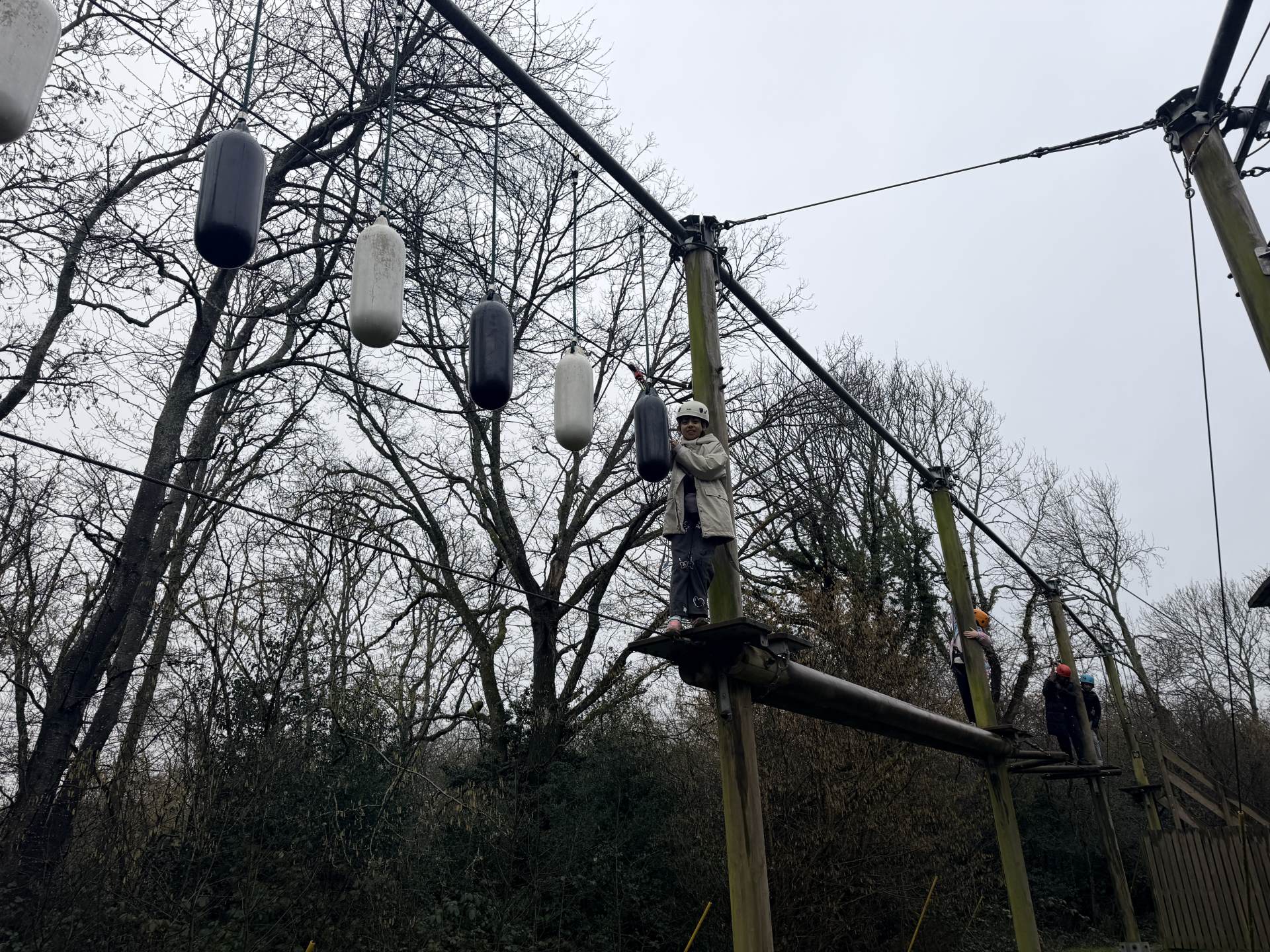 Then on to the most heart-racing event we've had so far- THE HIGH ROPES! We put on harnesses and helmets and settled in for the safety talk before we tackled the complex course. We had to push past our fears to complete the course in very tricky rainy conditions. The final step was a zip wire through the air into the end zone- we were like superheroes on the final run!