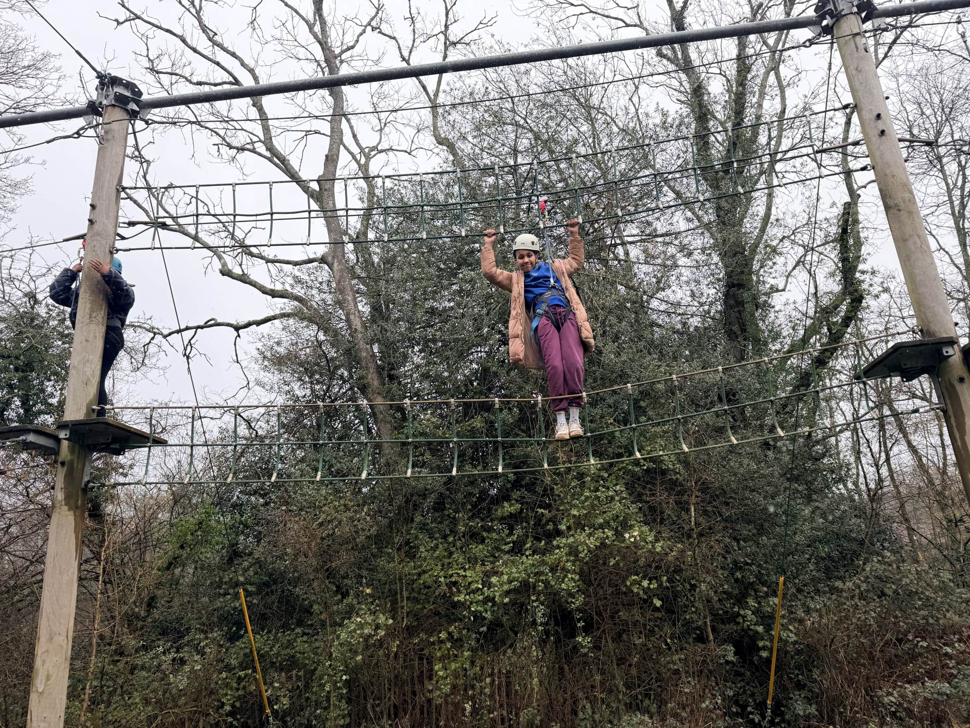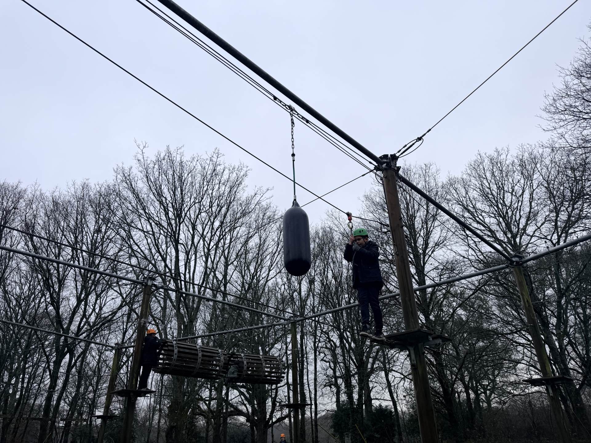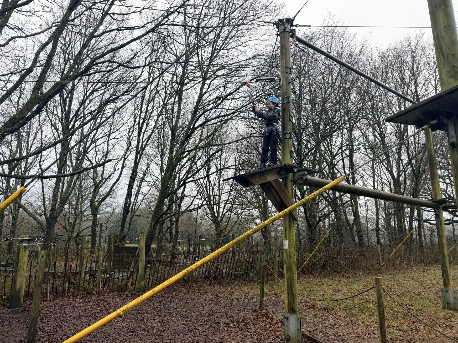 Then on to the most heart-racing event we've had so far- THE HIGH ROPES! We put on harnesses and helmets and settled in for the safety talk before we tackled the complex course. We had to push past our fears to complete the course in very tricky rainy conditions. The final step was a zip wire through the air into the end zone- we were like superheroes on the final run!
