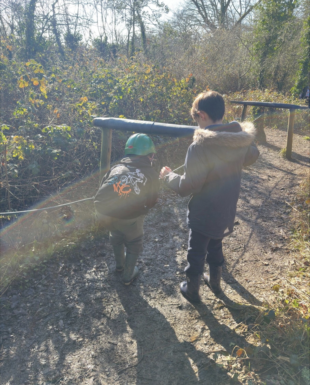 After that, we did a blindfold trail. One person had to wear a blindfold while their partner guided them through obstacles. It was tricky because you had to really listen and trust your partner. There were a few wrong turns and some muddy falls, but lots of laughing too!