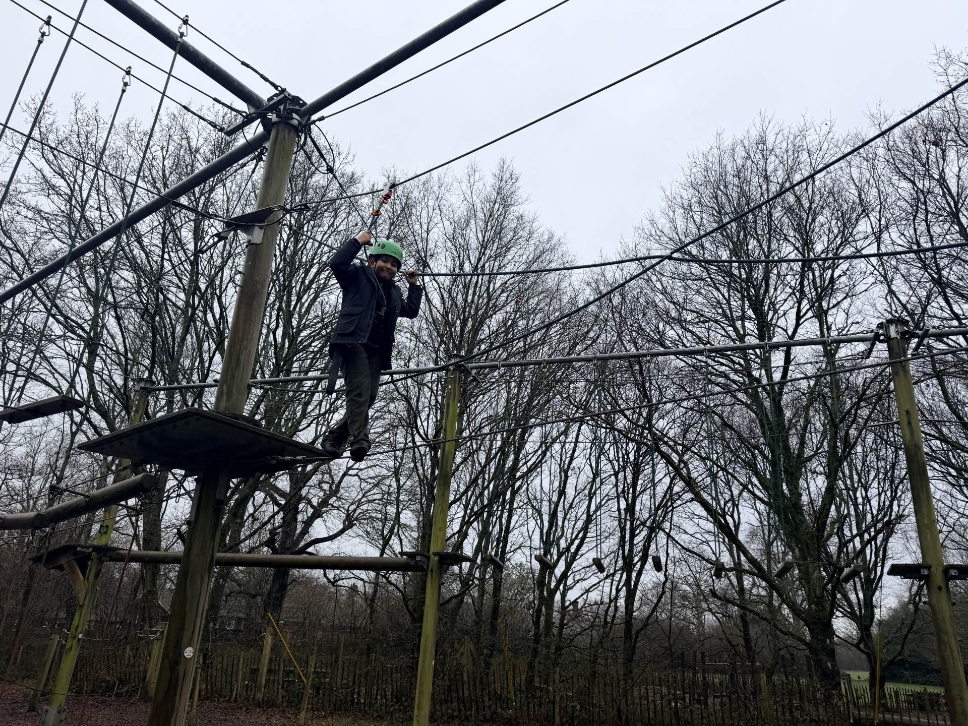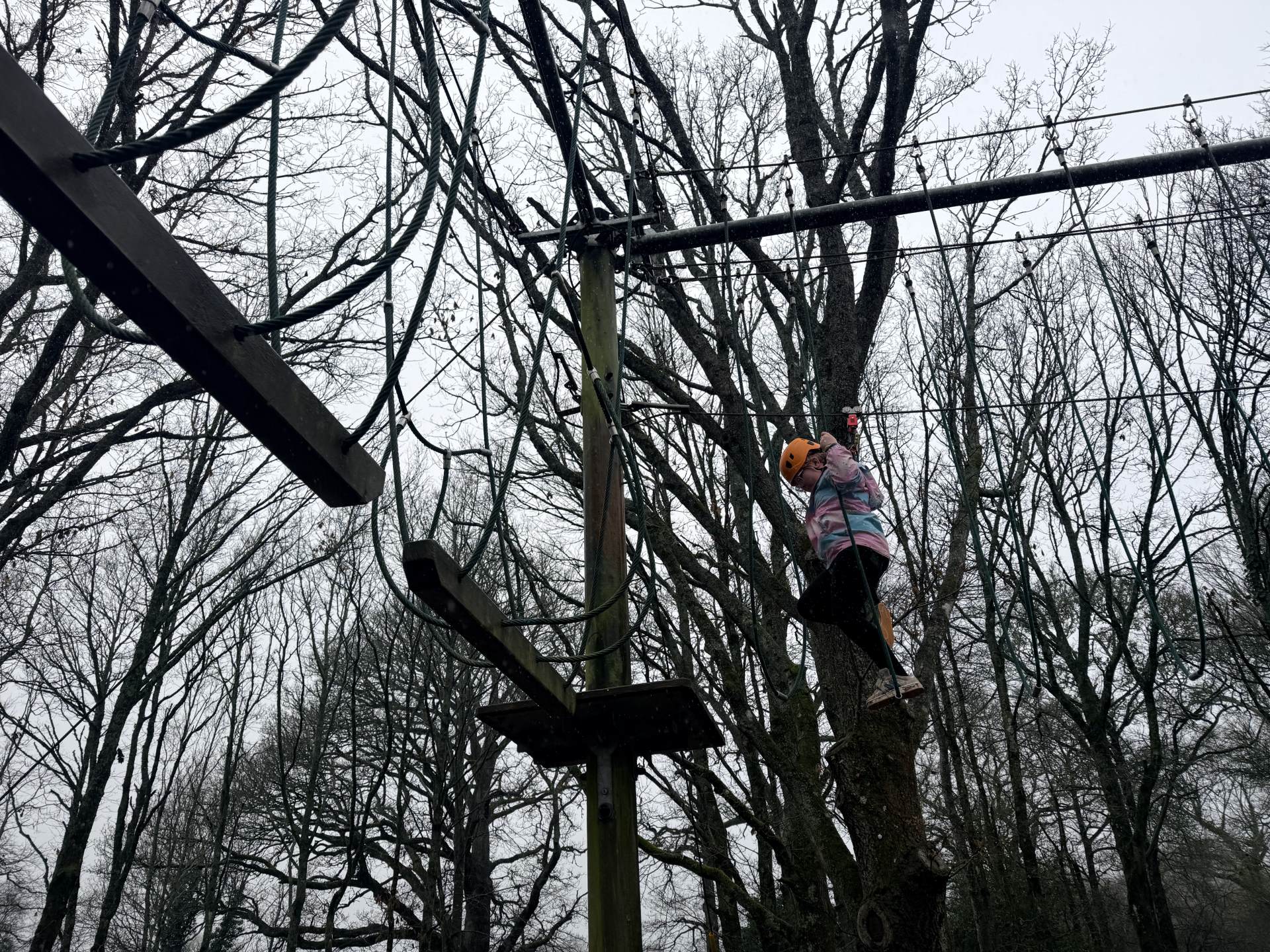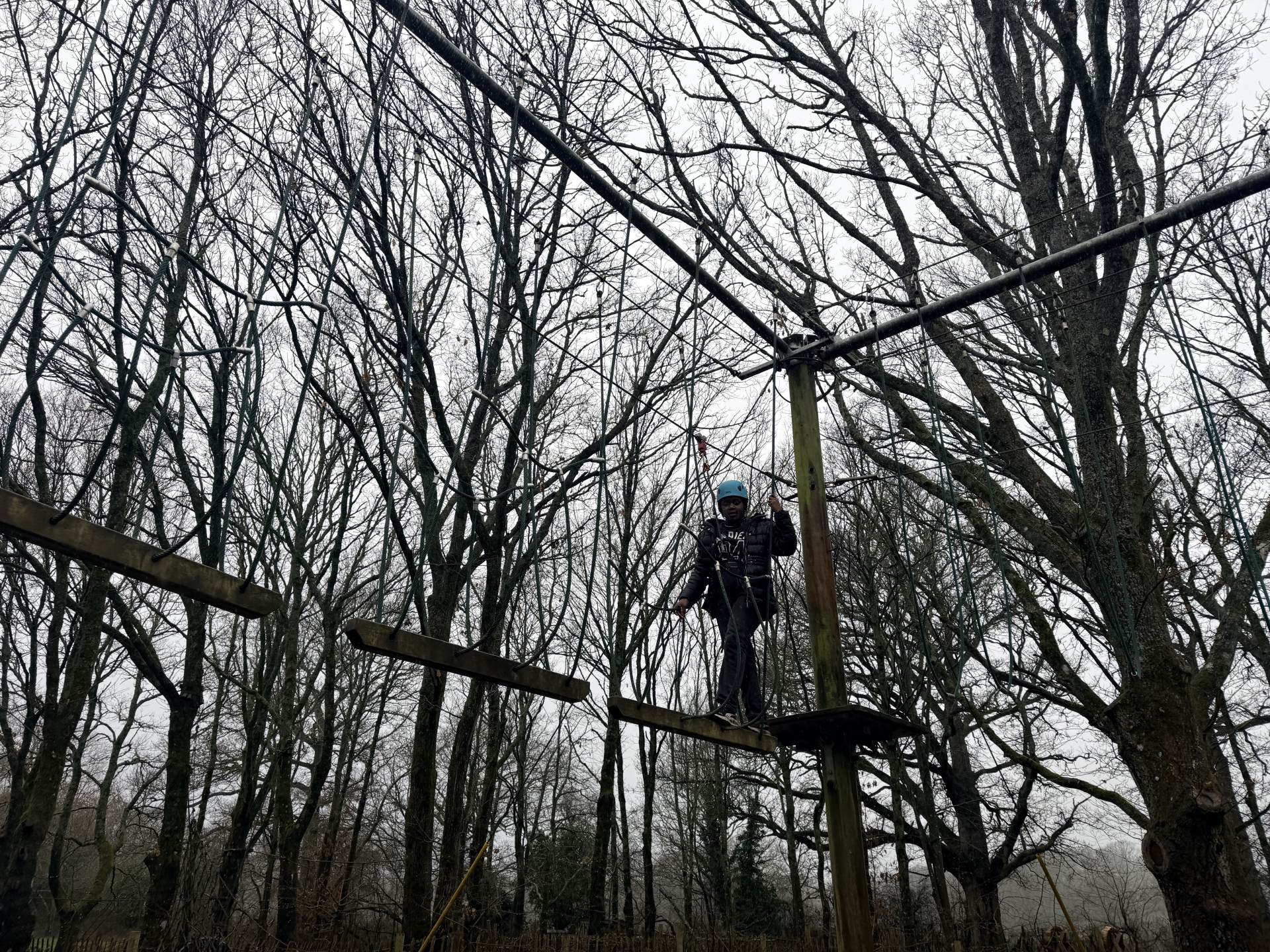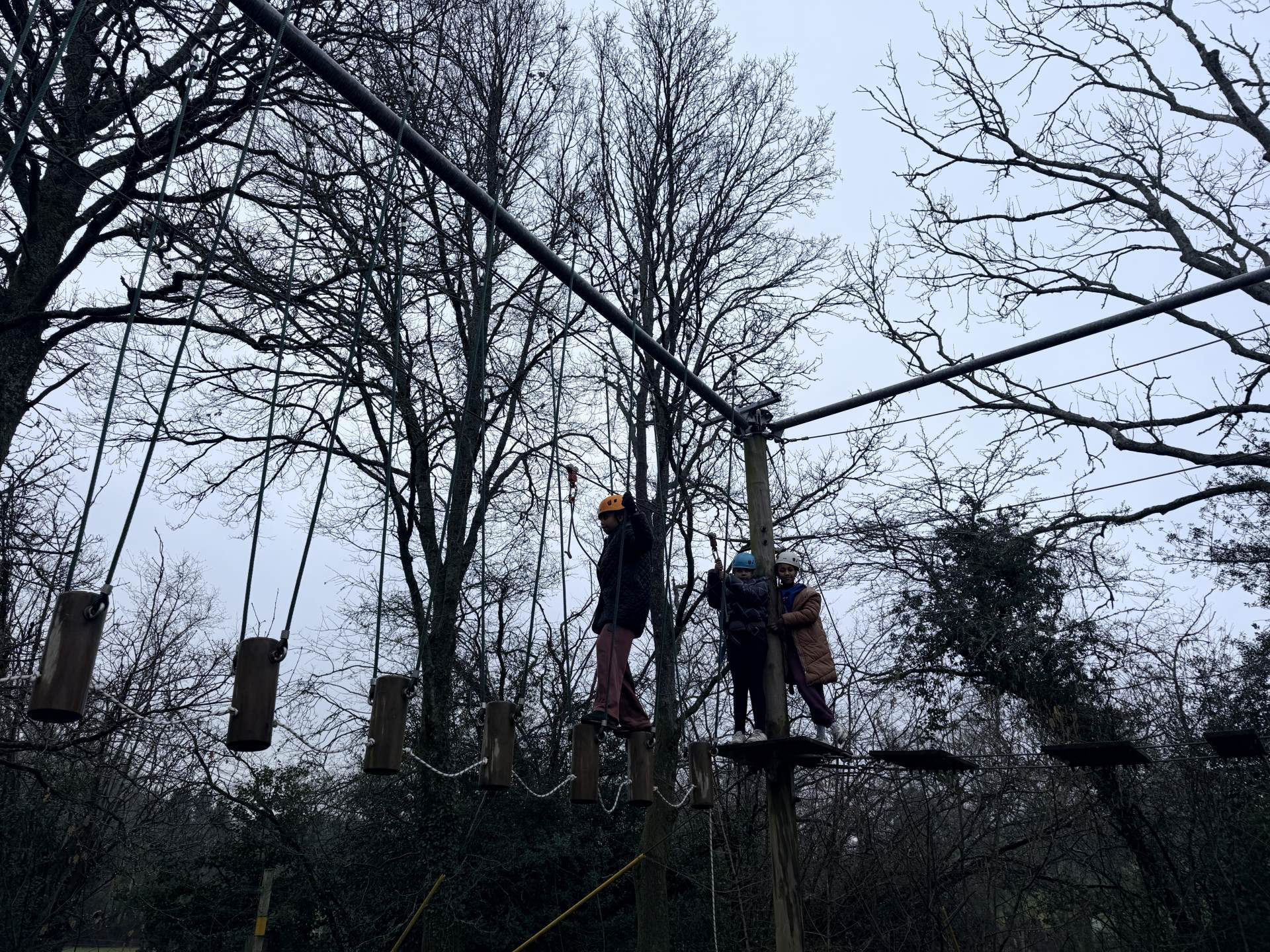 Then on to the most heart-racing event we've had so far- THE HIGH ROPES! We put on harnesses and helmets and settled in for the safety talk before we tackled the complex course. We had to push past our fears to complete the course in very tricky rainy conditions. The final step was a zip wire through the air into the end zone- we were like superheroes on the final run!